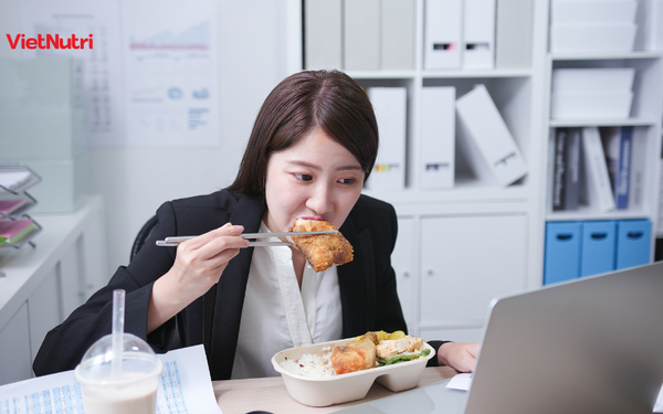 - Ăn trưa vội vàng với món chiên xào, cơm hộp nhiều dầu mỡ, thiếu rau xanh.