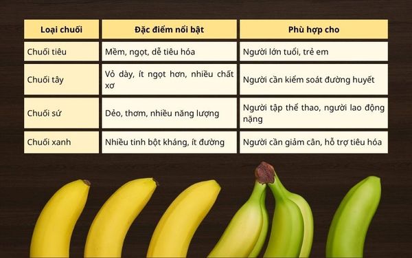 Việt Nam có nhiều giống chuối như chuối tiêu, chuối tây, chuối sứ, mỗi loại có hàm lượng tinh bột kháng, đường và xơ khác nhau. Dưới đây là gợi ý:
