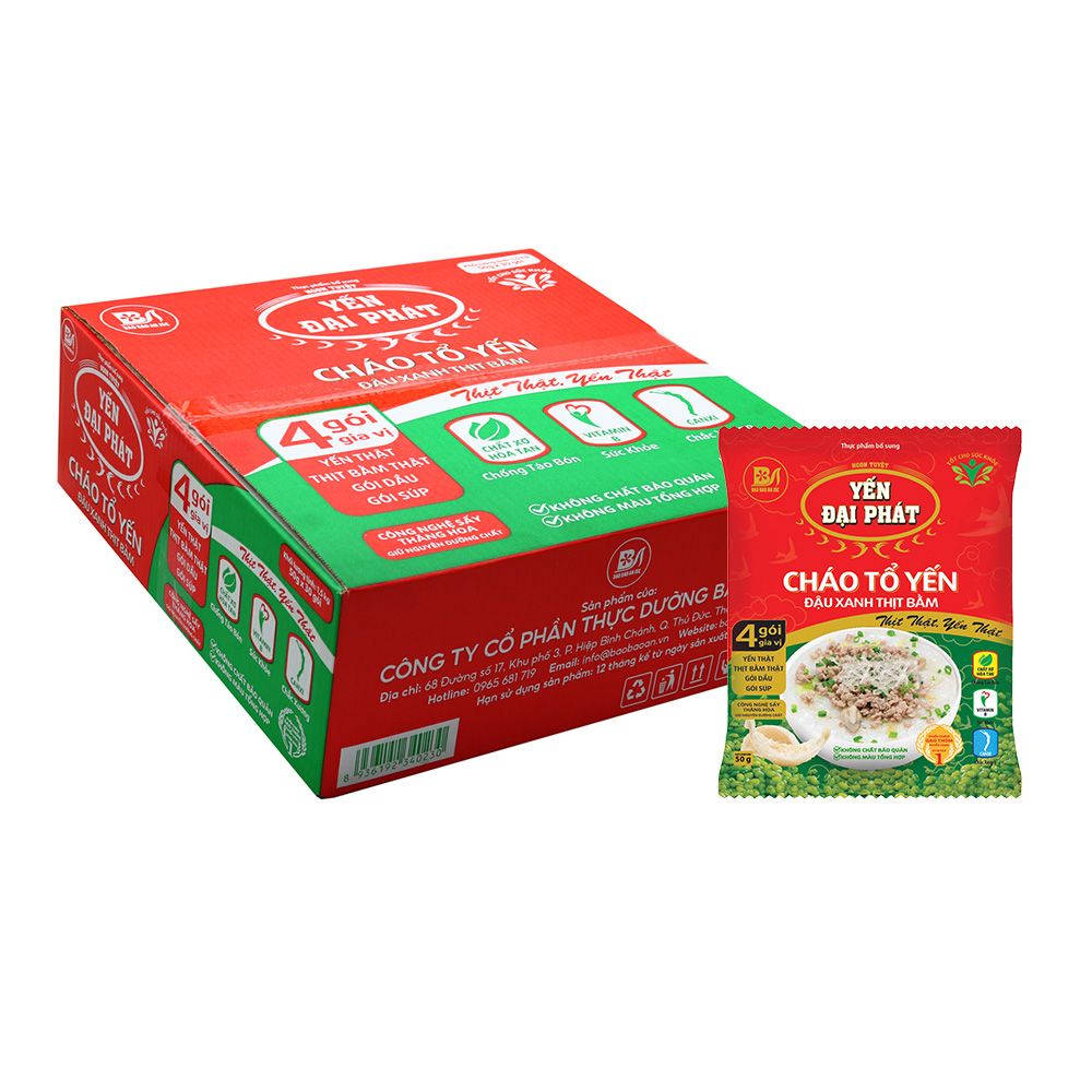 | Tiêu đề | Cháo tổ yến Đậu xanh thịt bằm – Thùng 30 gói, Cháo tổ yến Đậu xanh thịt bằm – Thùng 40 gói |